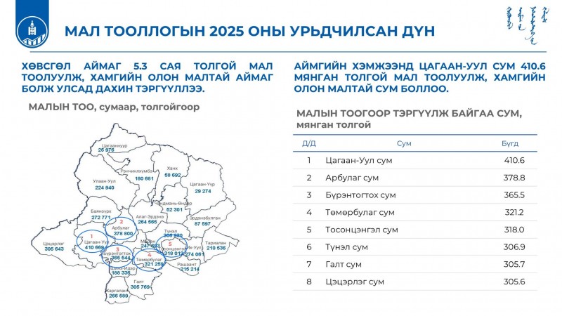 Хөвсгөл аймаг мал тооллогын урьдчилсан дүнгээр 5.3 сая толгой мал тоолуулж улсдаа тэргүүлсэн.